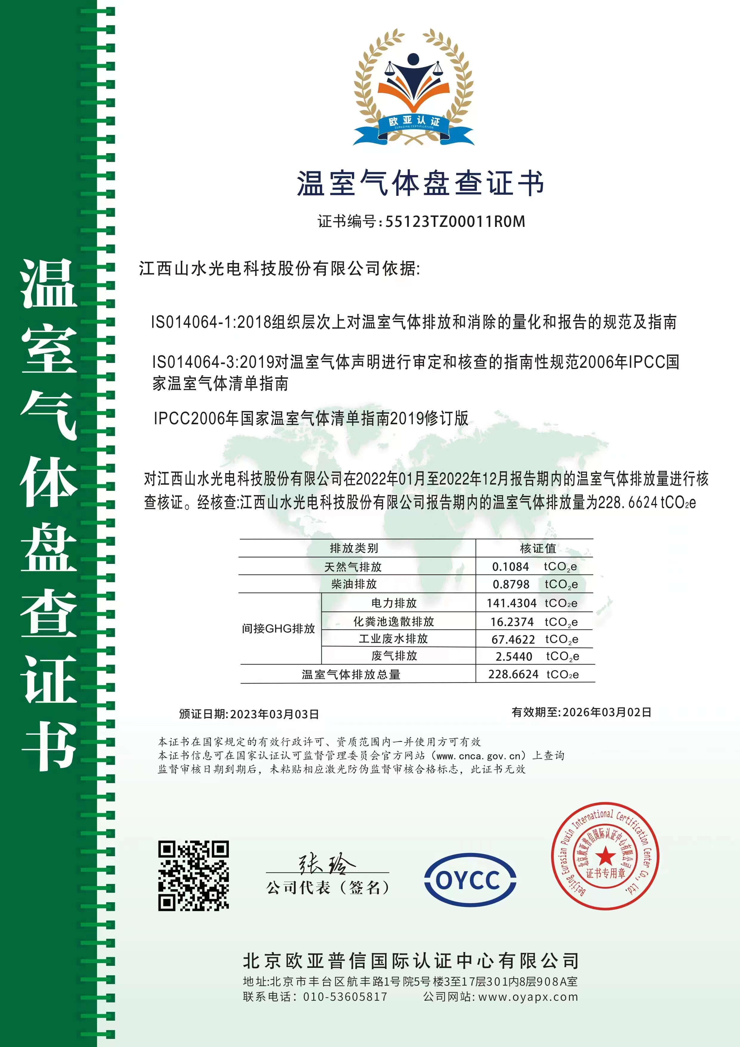 江西山水光电科技股份有限公司2022年度碳排放信息已通过北京欧亚普信国际认证中心核查并认证,相关证书见附件。